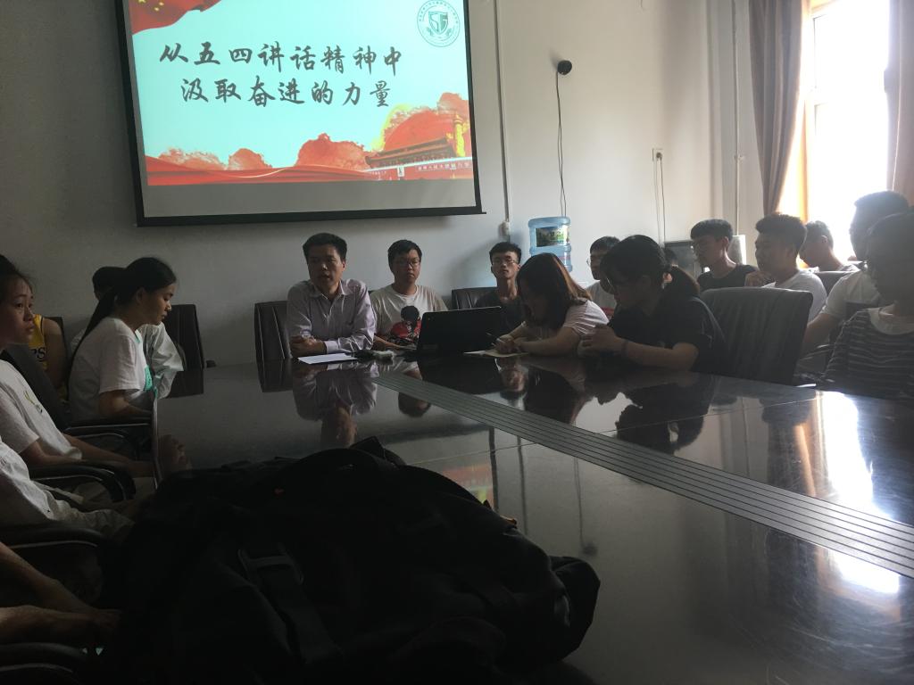 2019年05月17日,bat365中文官方网站党委副书记曹一伟在第四办公楼434会议室组织开展了题为“从五四讲话精神中汲取奋进的力量”学生思想政治课讲授活动。2018级五十余名学生参加了此次活动。