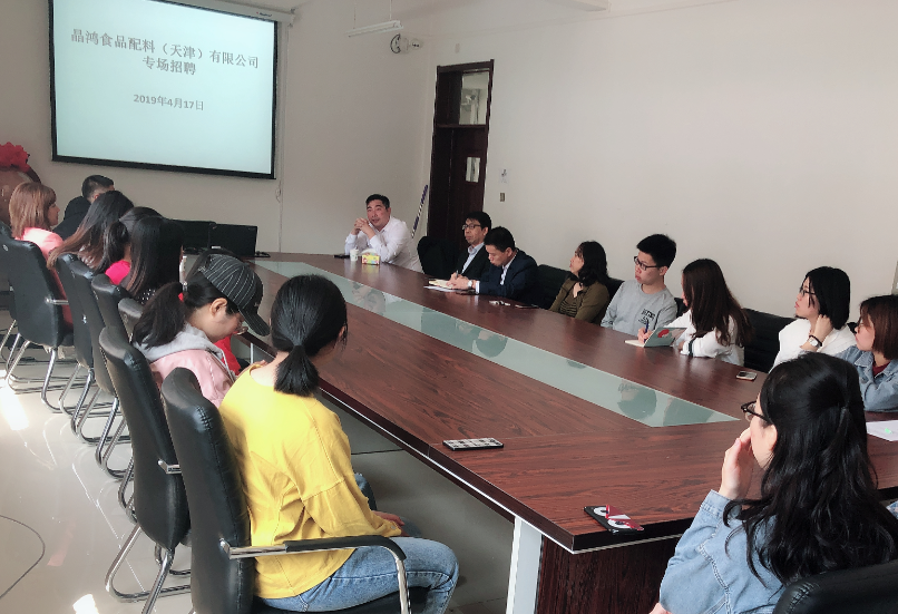 4月17日上午,bat365官网校友企业晶鸿食品配料(天津)有限公司专场招聘会在实验中心210会议室举行。此次招聘会由学院党委副书记曹一伟主持,院长赵士豪、副院长张香美以及部分大四学生参加了此次招聘会。
