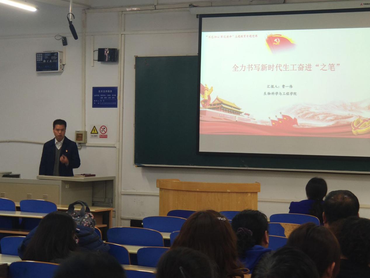 2019年10月21日下午,bat365中文官方网站党委书记曹一伟在第三教学楼A-201为全院老师做题为 “全力书写新时代生工奋进之笔”的主题党课,全院教师参加。