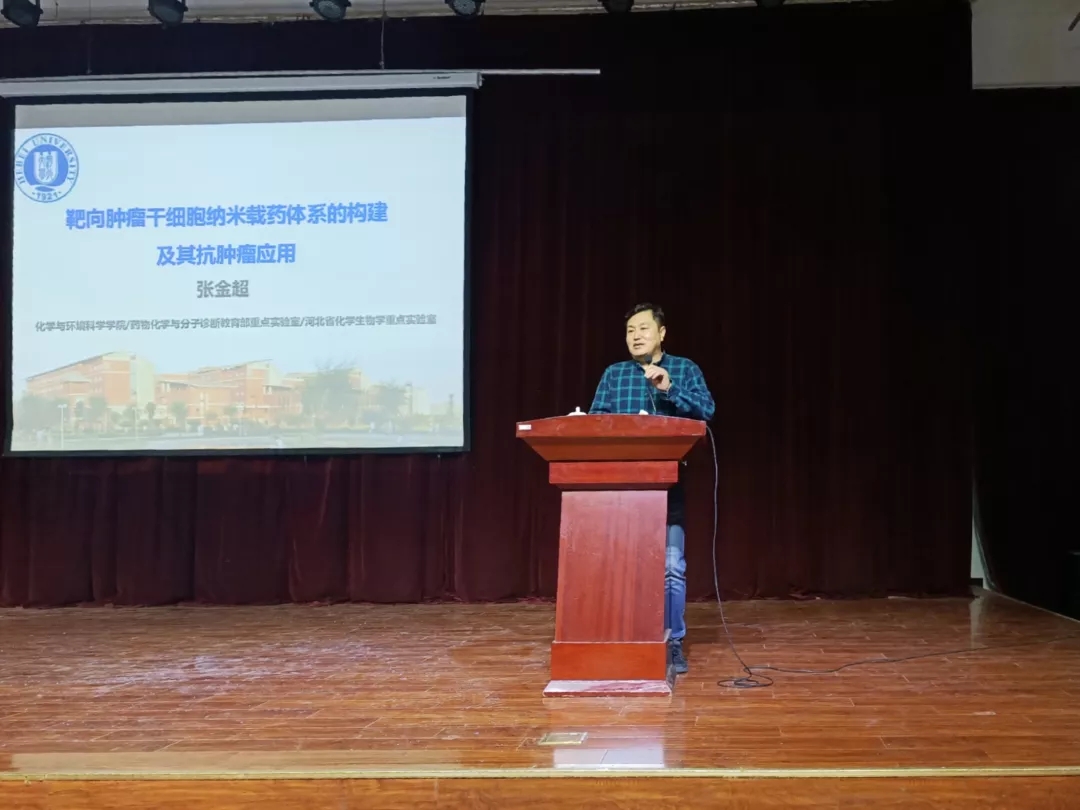 2019年12月16日下午3:30,河北大学化学与环境科学学院院长、药物化学与分子诊断教育部重点实验室常务副主任以及河北省化学生物学重点实验室主任张金超教授应bat365中文官方网站邀请,在大学生活动中心3号厅作了题为“靶向肿瘤干细胞纳米载药体系的构建机器抗肿瘤应用”的学术报告。报告会由bat365中文官方网站副院长张香美主持,本科生、研究生及教师400余人参加。