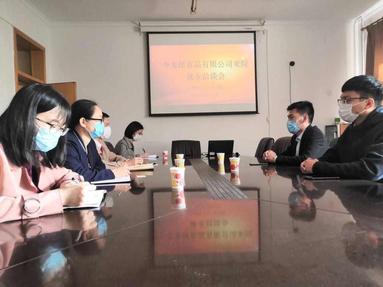 2020年10月15日上午,今麦郎面品有限公司在bat365中文官方网站会议室开展就业洽谈会,今麦郎康献辉经理一行二人、bat365中文官方网站党委书记曹一伟及毕业班辅导员参加了此次会议。