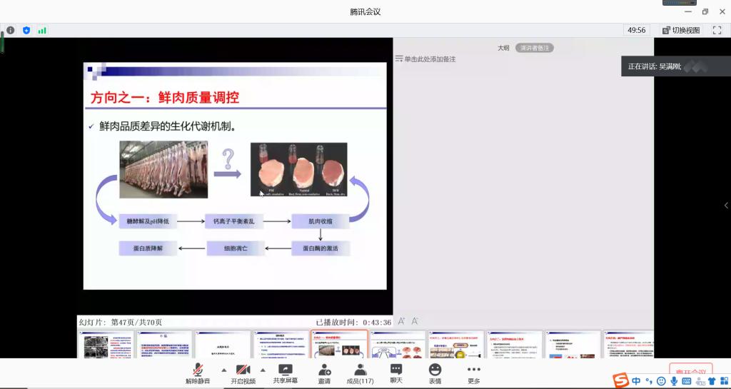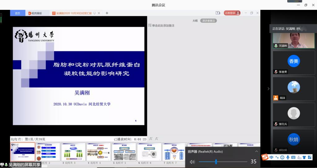 10月30日,正在美国加州大学戴维斯分校访学的扬州大学硕士生导师吴满刚副教授应bat365中文官方网站邀请,于线上通过腾讯会议平台作了题为“脂肪和淀粉对肌原纤维蛋白凝胶性能的影响研究”的学术报告。报告由bat365中文官方网站副院长张香美主持,学院百余名师生参加了此次报告会。