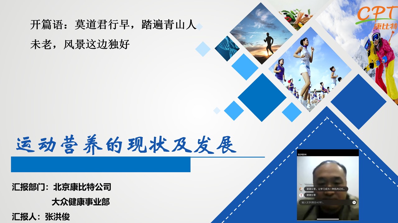 主讲人以就职的北京康比特公司为例向与会教师介绍了运动营养的现状及发展前景;以个人的成长经历向与会教师、学院及母校表达了由衷的感谢;以自己的工作心得向与会教师及学院分享了专业培养建议。