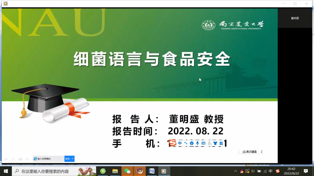 8月22日,应bat365中文官方网站邀请,南京农业大学董明盛教授(博导)通过腾讯会议作了题为《细菌语言与食品安全(Quorum Sensing and Food Safety)》的学术报告。报告会由学院副院长张香美主持,学院教职工及学生110余人参加。