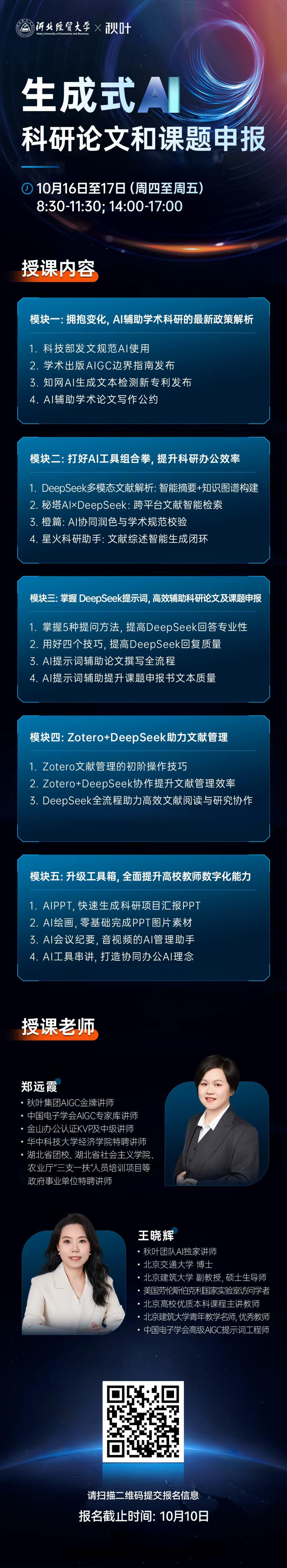 请参加培训的导师,于10月10日17:00前,扫描海报下方报名二维码,填写所在学院、姓名、工号、联系电话等信息提交报名;报名时需选择参与此次培训方式:“线下(可实操)”或“线上”,一经选择原则上不更改。若线下培训场地名额已满,将优先协调线上参与名额,并通过电话告知。